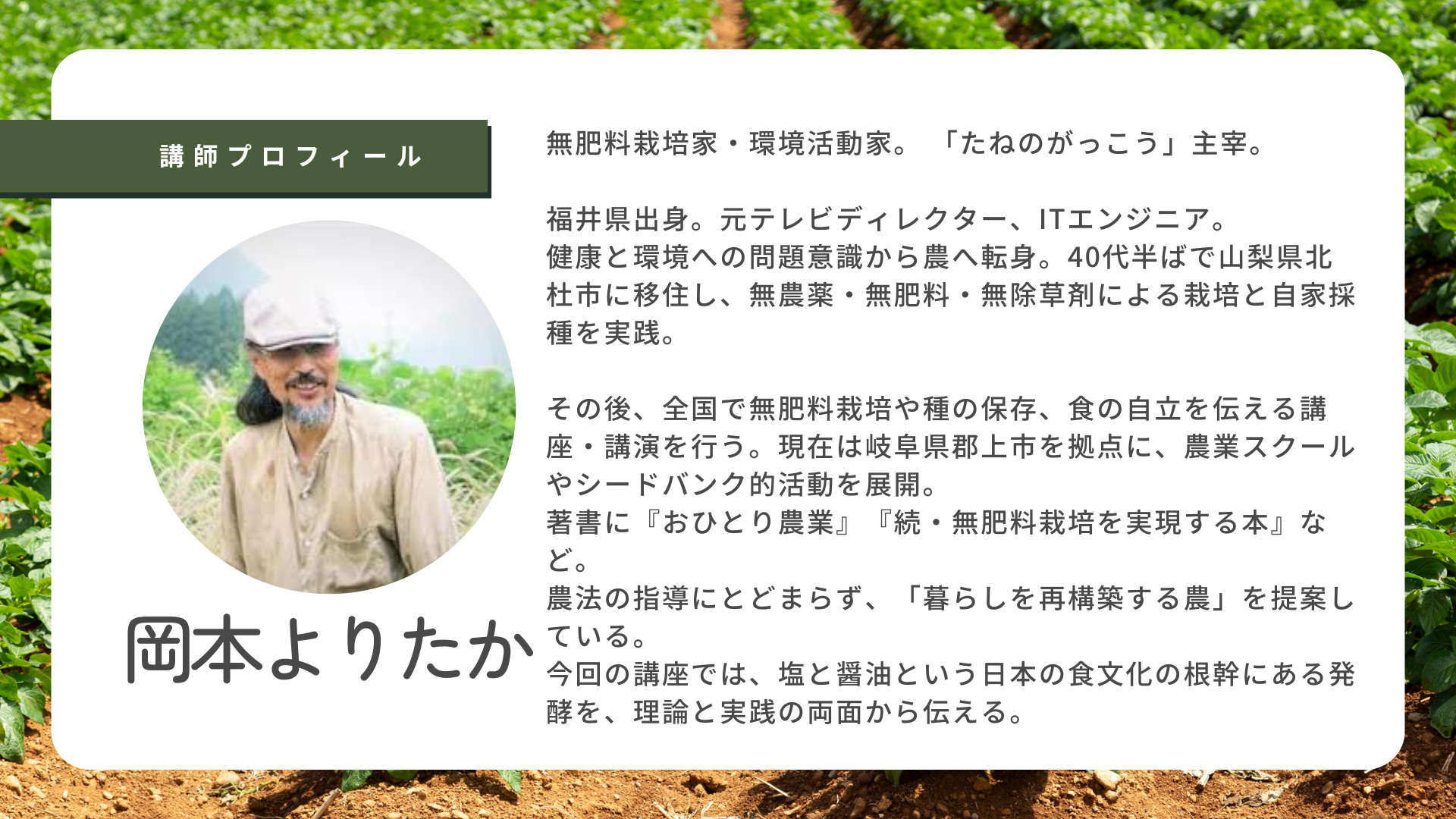 岡本よりたかさんをお招きして、塩と醤油づくりの4日間集中講座を開催予定です。